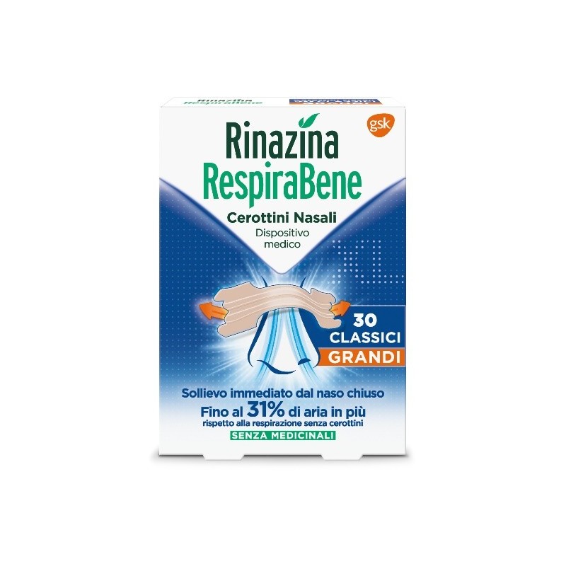 Rinazina RespiraBene Cerottini Nasali Classici Grandi per Adulti 30 Pezzi